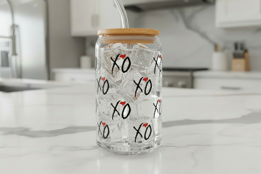 Vaso de vidrio XO de 16 oz con pajita de plástico transparente