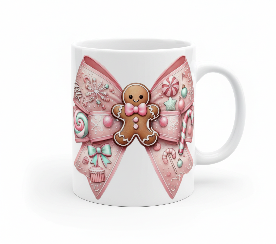 The Pink Gingerbread Coquette Bow is a UVDTF decal designed for cups and hard surfaces. It features a charming gingerbread design and festive elements like candy canes and snowflakes. The decal is not dishwasher safe and requires hand-washing with warm water and soap.