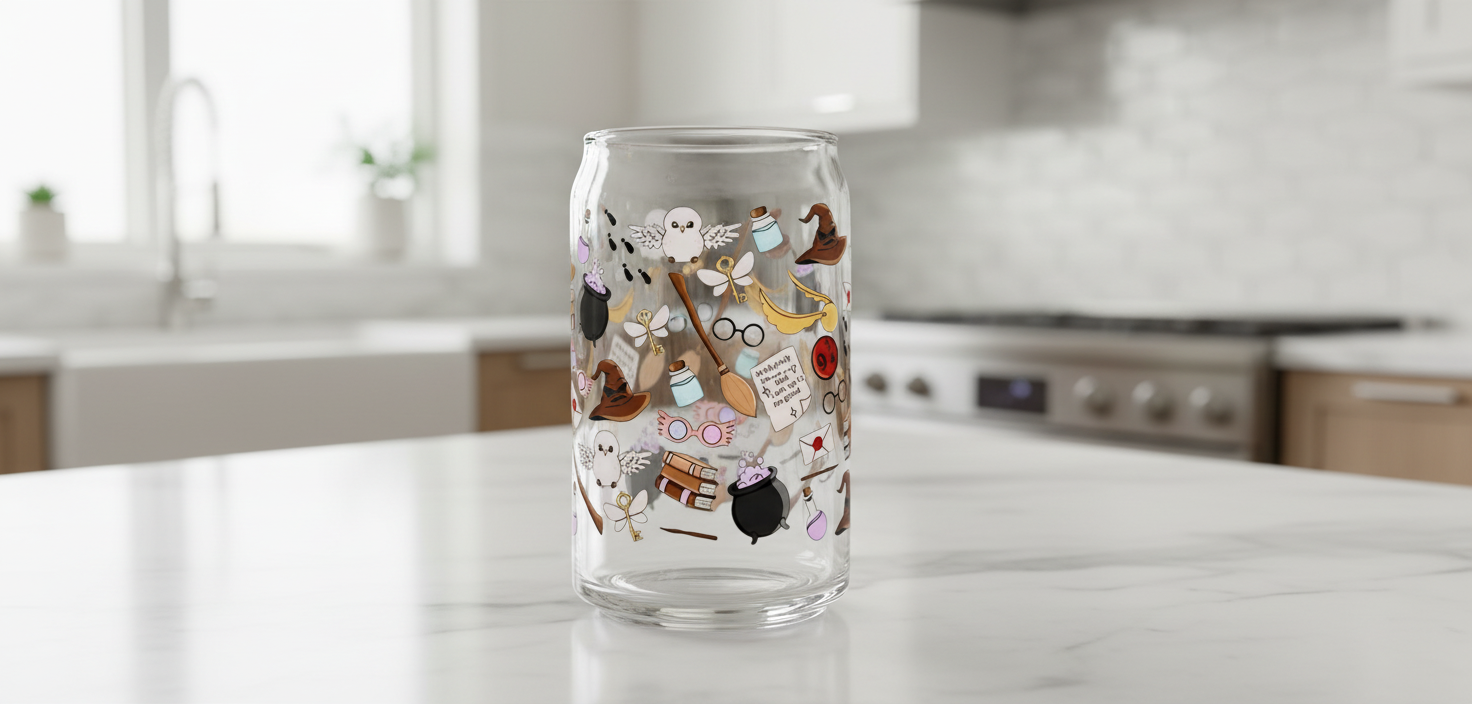Harry's Essentials offers a UVDTF wrap for cups and hard surfaces. This sticker is not dishwasher safe. Hand wash with warm water and soap only. You'll receive one UVDTF wrap. Ensure the surface is clean before application. Size is approximately 4" x 9".